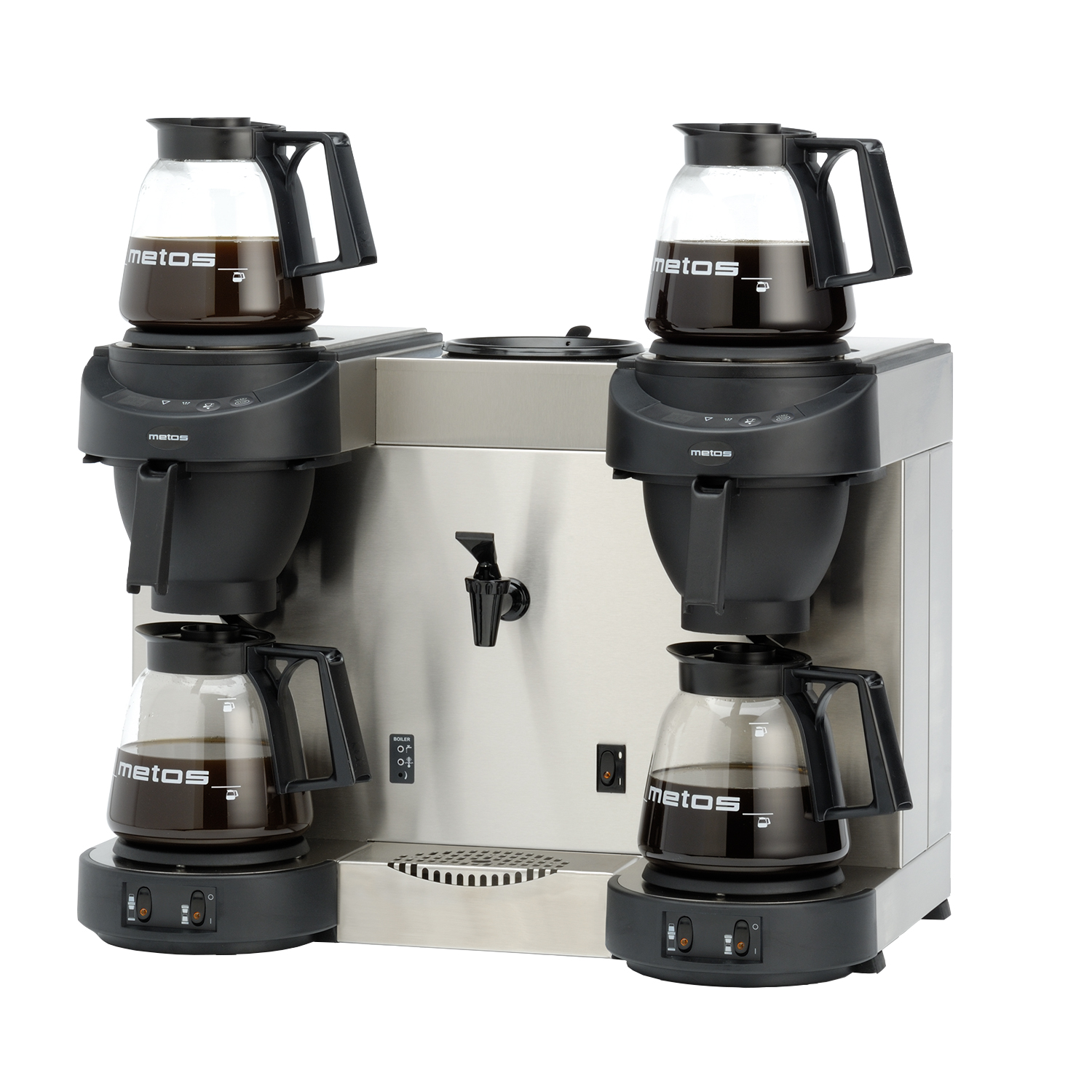 Dvi kavos gaminimo vietos ir karšto vandens ciaupas;
